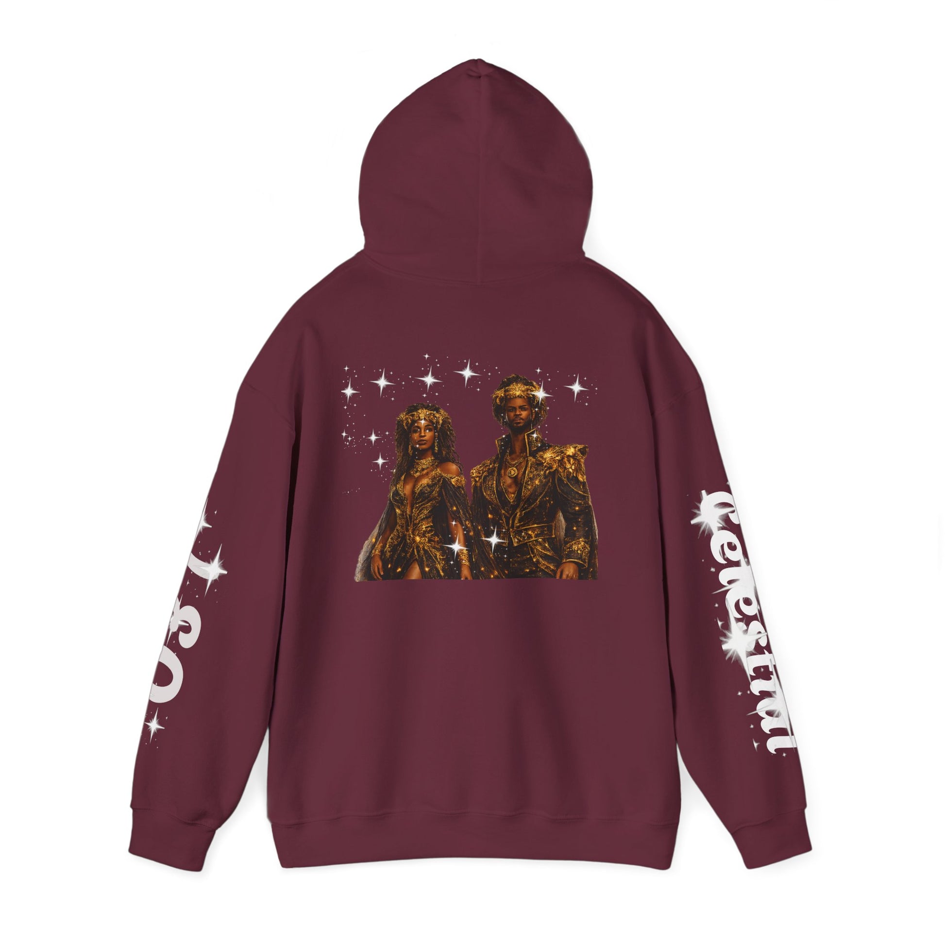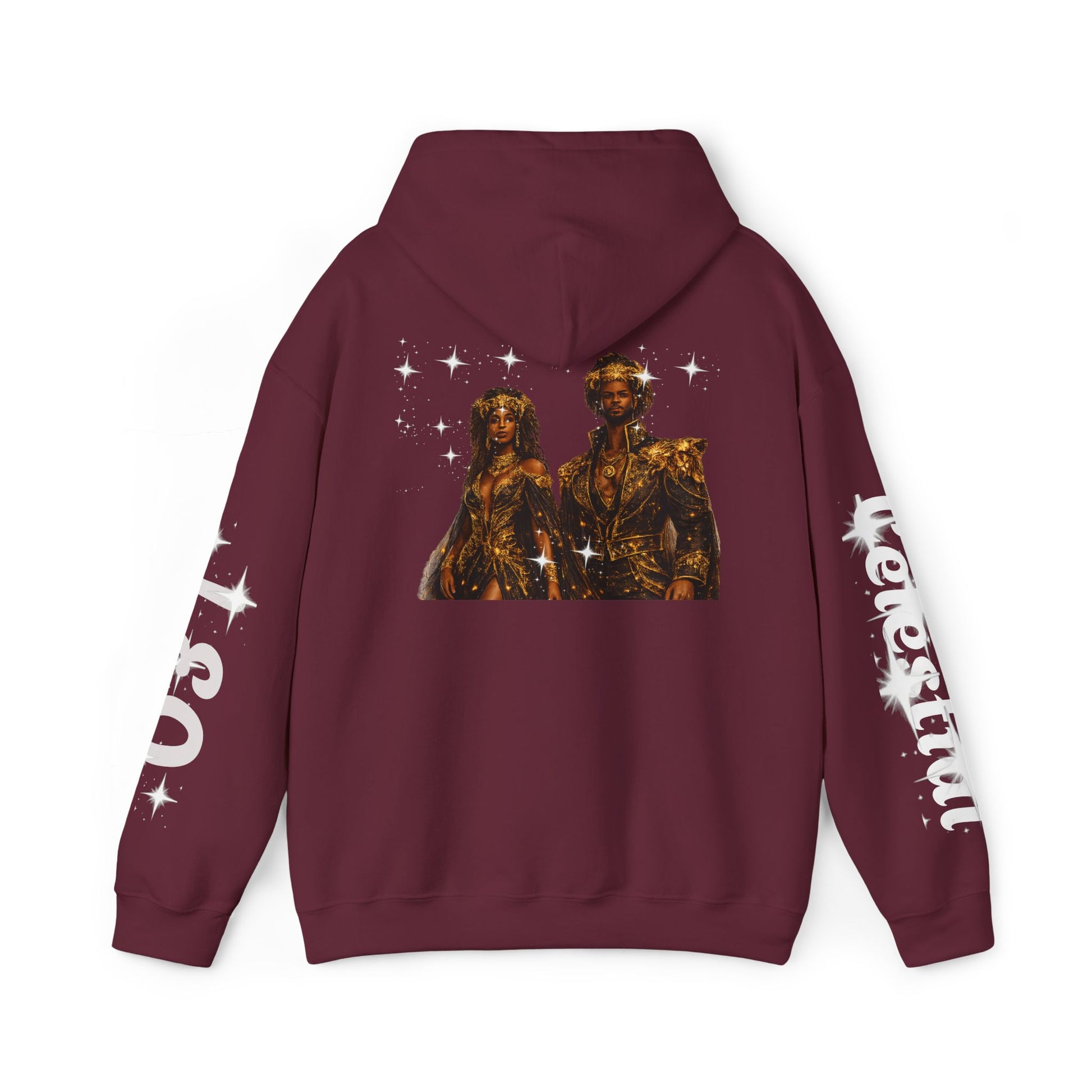 The female muse radiates in a structured black-and-gold gown with flowing celestial layers that move like liquid sunlight. Her lion-inspired crown frames her natural volume with regal intensity. She does not ask for attention. She generates it.